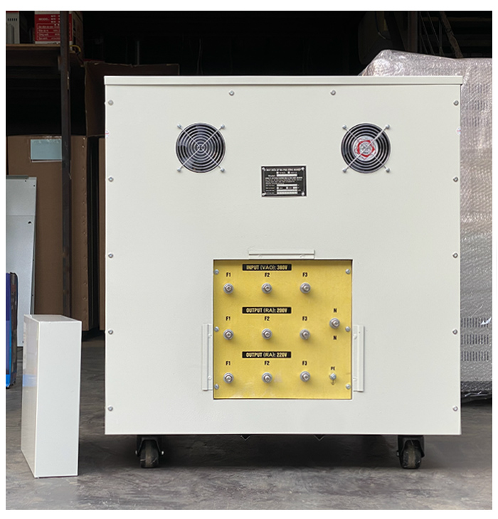 Máy biến áp 150kva 3 pha chỉ có chức năng đổi nguồn hạ áp 380V sang 220V/3F và 200V/3F (không có tính năng ổn định điện áp). Tức là: điện áp đầu ra sẽ biến thiên theo đầu vào. Nếu điện áp vào tăng thì ngay lập tức điện áp ra cũng sẽ tăng theo tỉ lệ thuận và ngược lại.