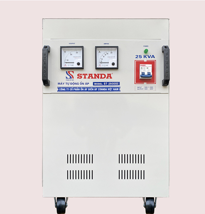 - Ổn áp standa 25kva hđộng theo nguyên lý điều chỉnh động cơ giúp dòng điện ổn định liên tục.