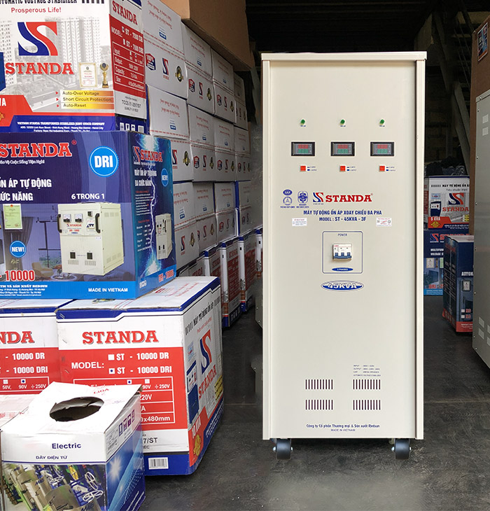 – Ổn áp Standa 45kVA dải 160V hoạt động theo nguyên lý điều chỉnh động cơ giúp dòng điện ổn định liên tục.