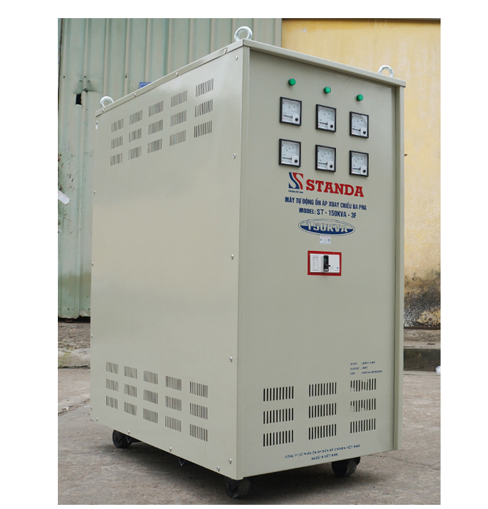 - Ổn áp standa 150kva 3 pha hoạt động theo nguyên lý điều chỉnh động cơ giúp dòng điện ổn định liên tục.